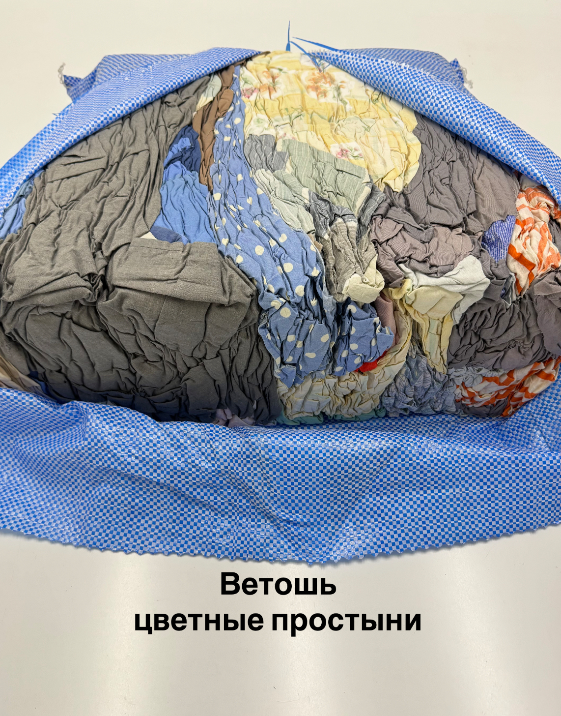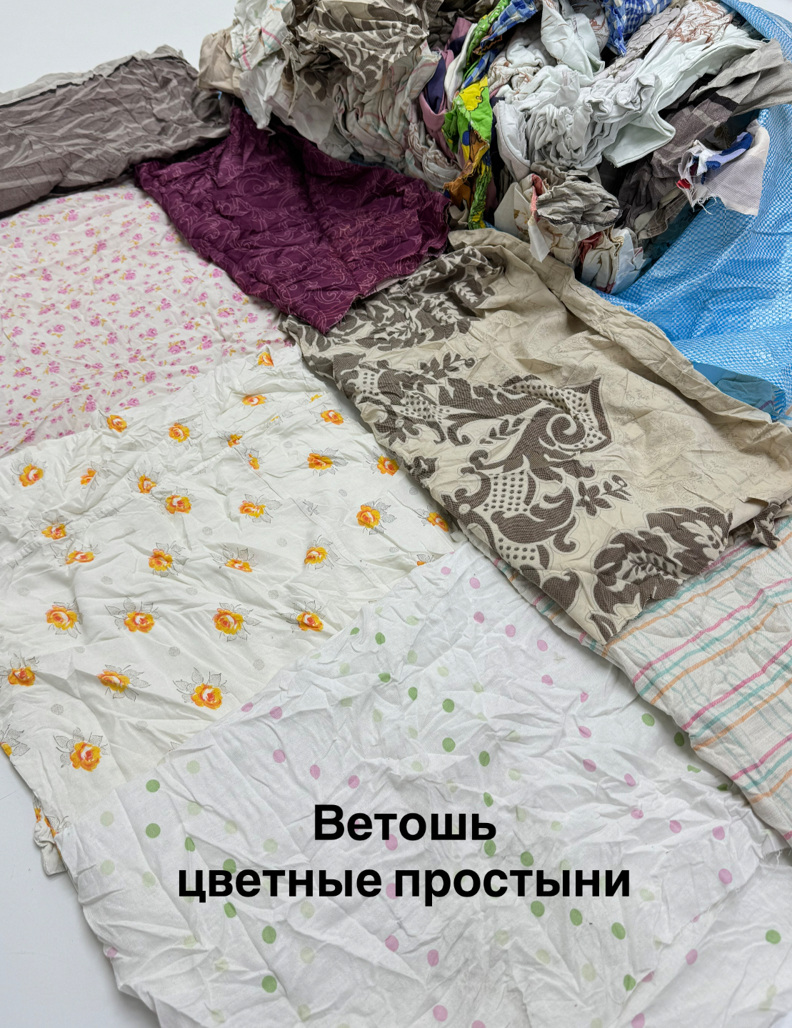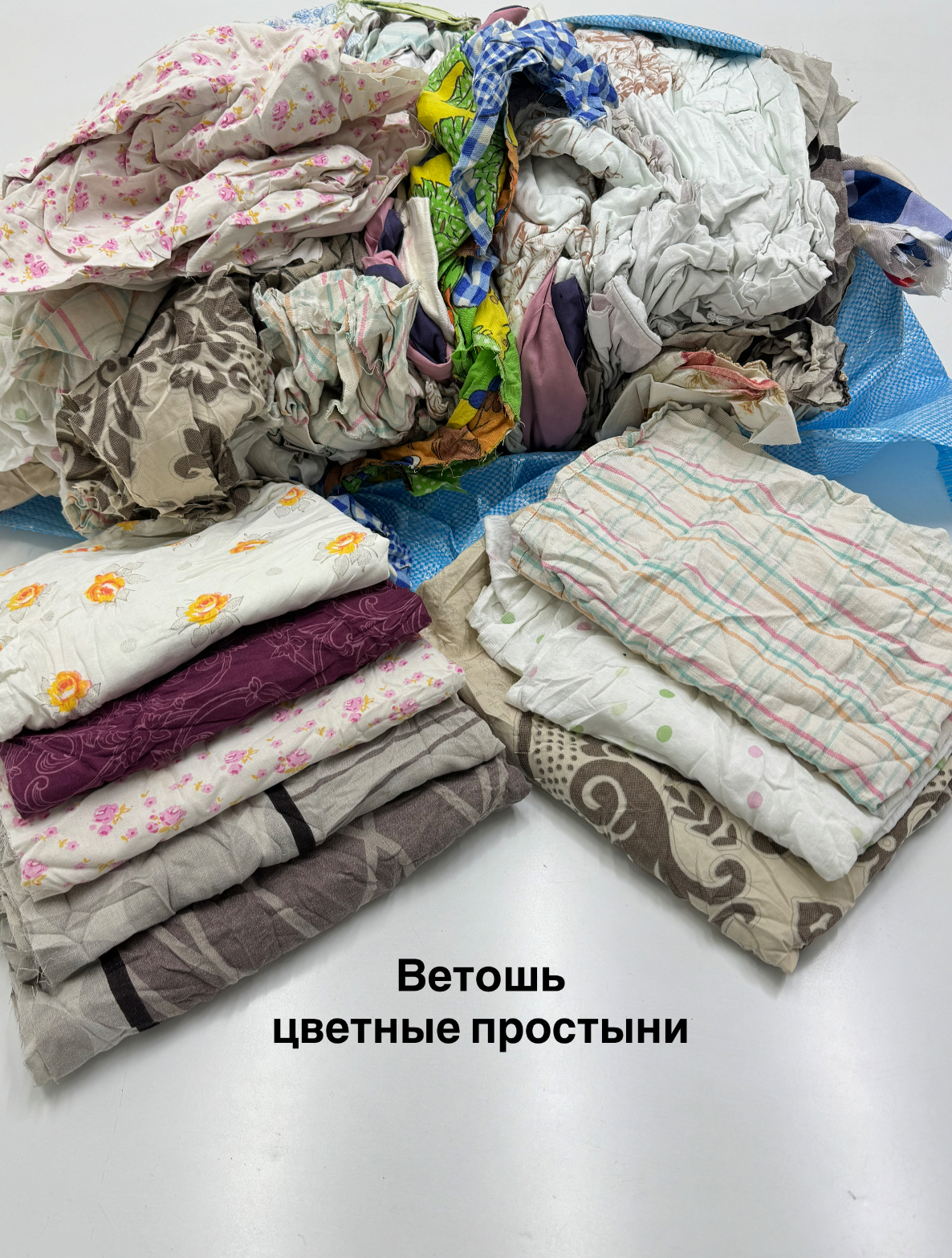 Переработанное цветное постельное белье секонд-хенд (пододеяльники, простыни, наволочки, наматрасники из сатина, бязи, ситца и аналогичных гладких безворсовых тканей). Крупные лоскуты неправильной формы, средний размер - до 70х80 см с минимальным количеством швов. Простыни – наиболее качественная и универсальная ветошь в нашем ассортименте, является более дешевой альтернативой технической салфетке и практически не уступает ей по качеству. Продукт отлично впитывает воду, краску, масло и нефтепродукты, применяется в большинстве отраслей промышленности, не оставляет ворса. Упаковка - брикет 10 кг